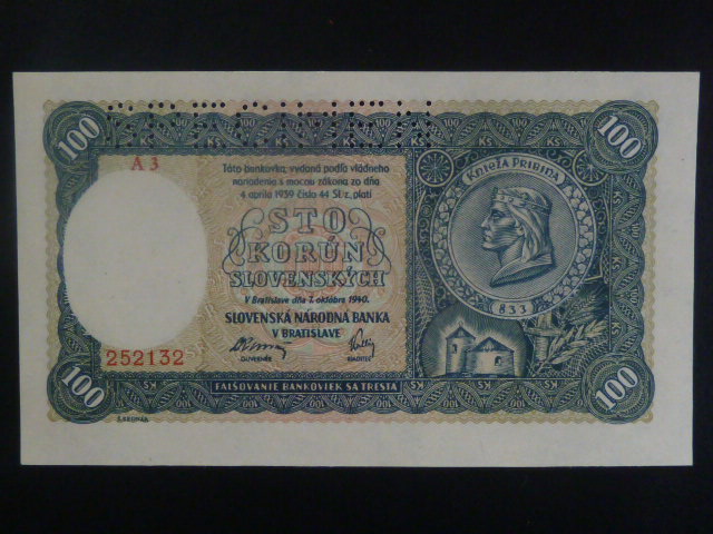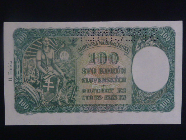 100 Ks 1940 II.vydání, série A 3, 1x perf. SPECIMEN nahoře