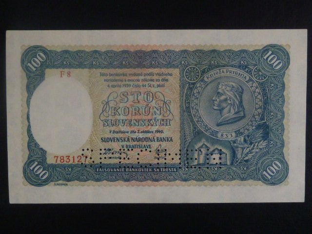 100 Ks 1940 II.vydání, série F 8, 1x perf. SPECIMEN dole