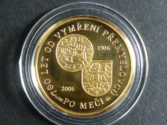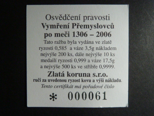 Au medaile Vymření Přemyslovců po meči 1306 - 2006, Au 585, 3,5 g, průměr 28 mm, náklad 200 ks, certifikát č. 61, etue