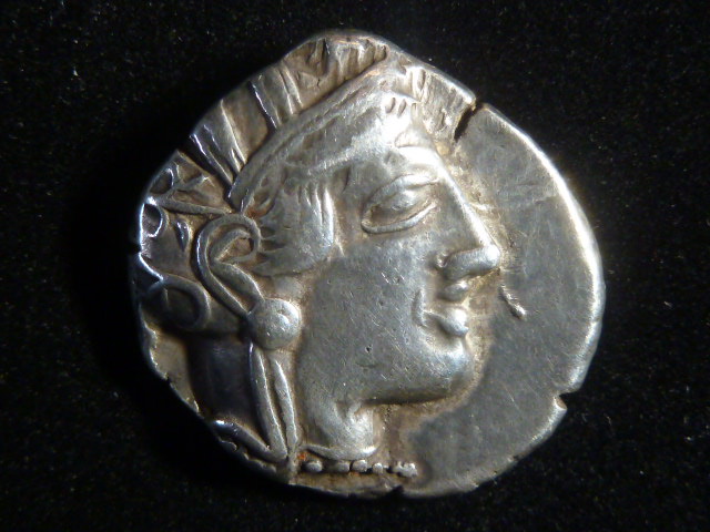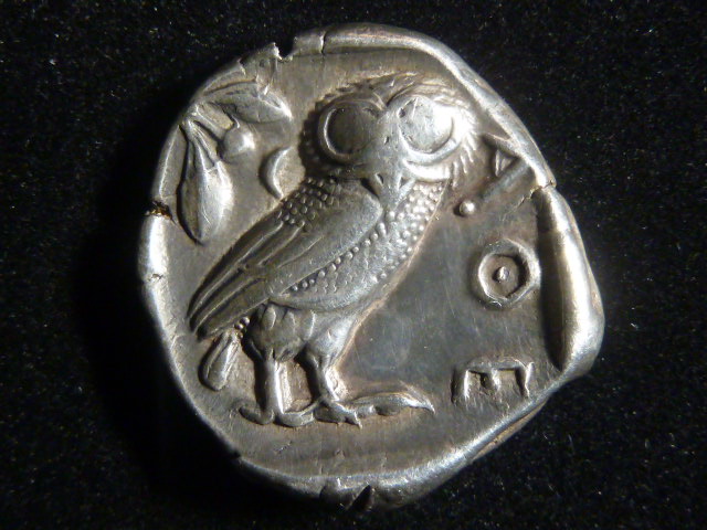 rev: nápis AΘE - zkratka pro AΘENAION (Athenaion) = "patřící Atheňanům"