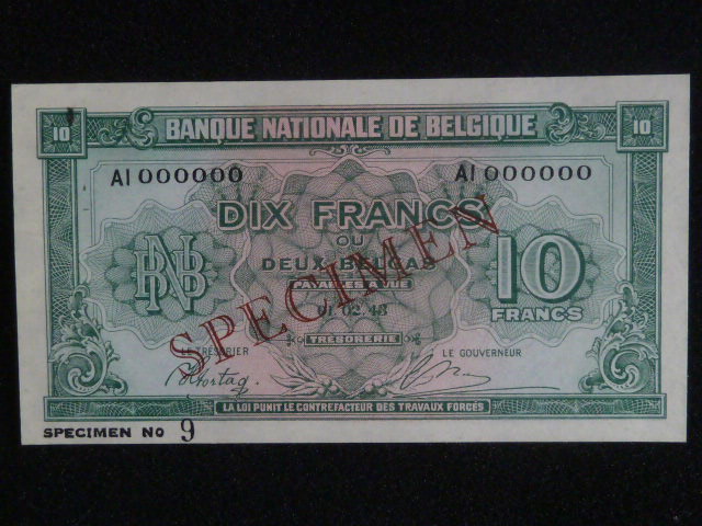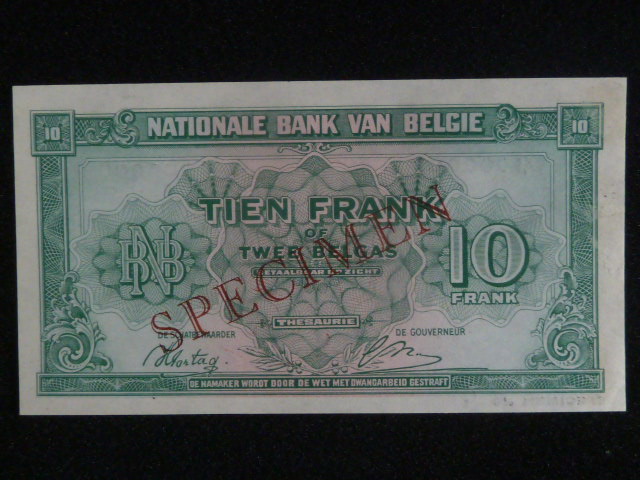 10 Francs/2 Belgas 1943, SPECIMEN anulát, BNB. B570as2, Pi. 122
